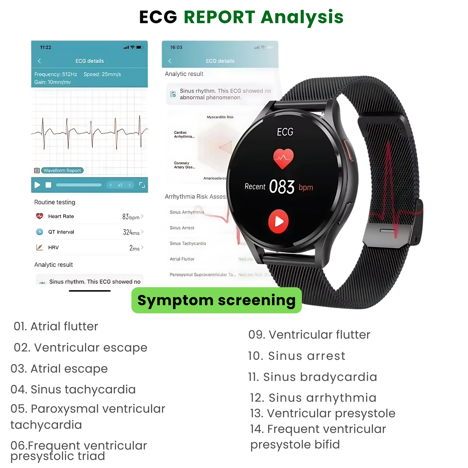 ECG Monitoring to assess heart health—the traditional way is often time-consuming and inconvenient. With the Smart Health Glucose Smart Watch, you can monitor your ECG anytime, anywhere. Based on the principle of electrocardiogram measurement, the watch collects cardiac bioelectrical signals, and your ECG data can be viewed directly in the Smart Health mobile app to help you understand your heart health status with ease.
