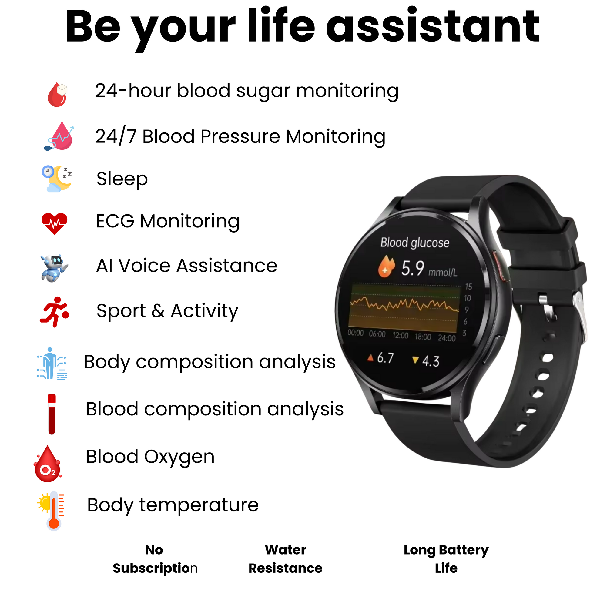 At the core of the Smart Health Glucose Smart Watch are cutting-edge biometric sensors and intelligent algorithms. This advanced technology seamlessly integrates into your daily routine, offering accurate blood glucose monitoring and a comprehensive wellness overview—24/7. Stay connected with your loved ones while keeping your health in check with our continuous gluocse monitoring watch.
